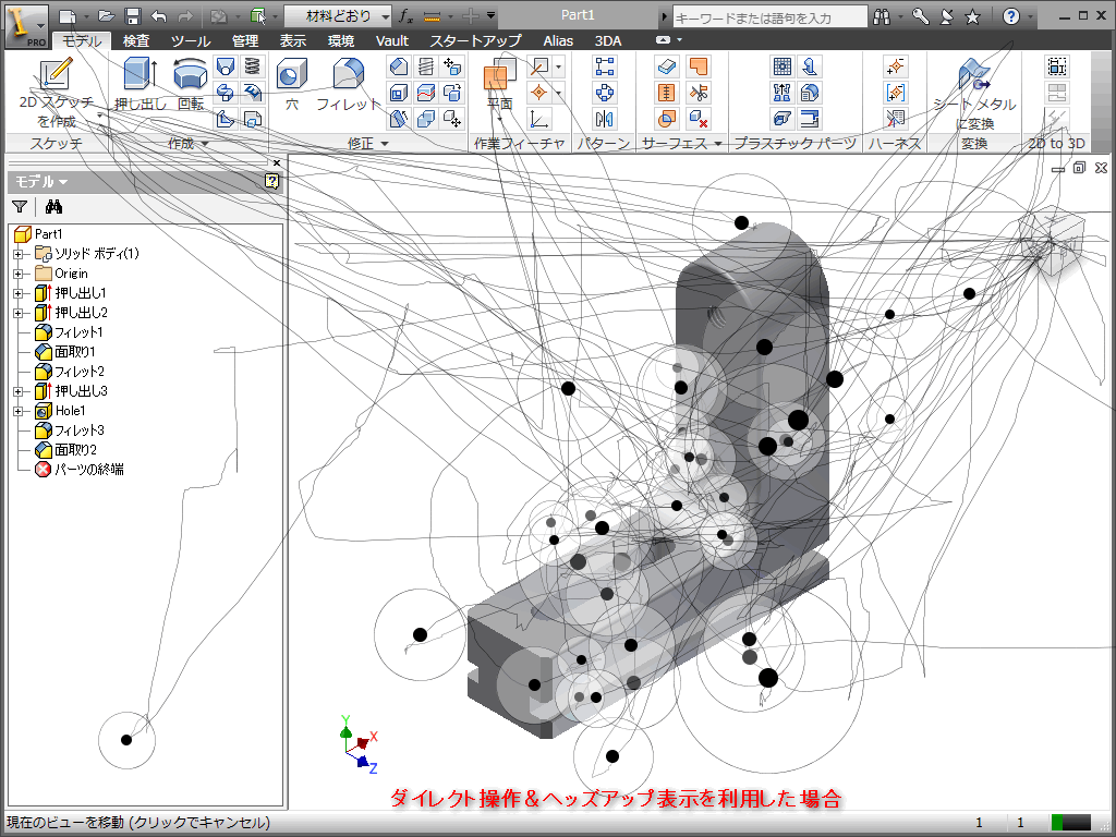 ダイレクト操作とヘッズアップ表示を使ったときと使わなかった時の操作を表していますが、5分程度のモデリングでも線の多さ(マウスの移動の多さ)の差が分かり、ダイレクト操作とヘッズアップ表示の効果が分かります。