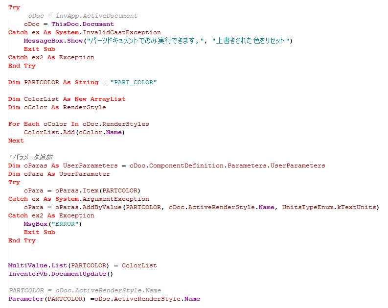 実は、iLogic では、VB.NET で作成したInventor のカスタマイズプログラムのコードを、ほとんどそのまま利用することができます。