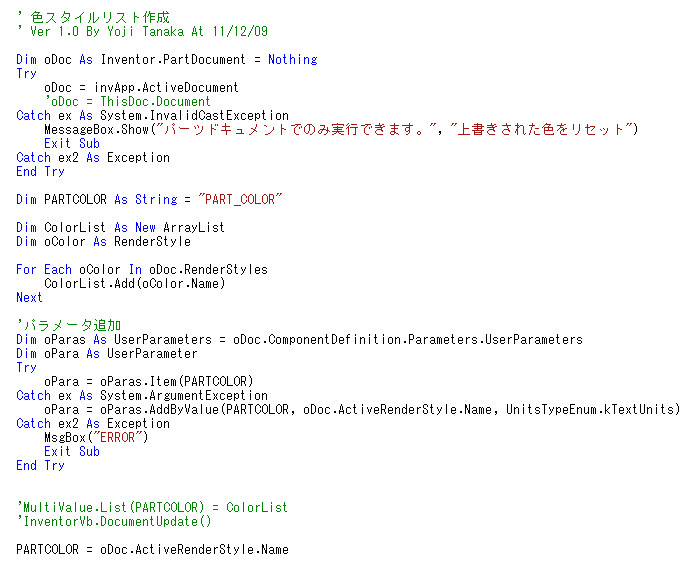 これは、Visual Studio で作成したコードです。開いているドキュメントの色スタイルの名前のリストを、マルチバリューパラメータに登録する処理を行なっています。