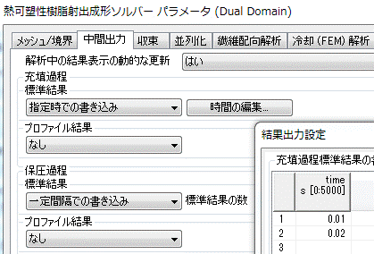 次にソルバーパラメータ編集>中間出力タブ、標準結果で指定時での書き込みを選択>時間編集で何か数字を入れます。例として0.01、0.02秒を指定します。