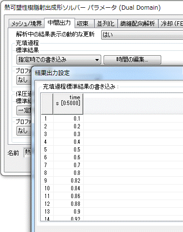 Insightでは充填/保圧過程でソルバーが標準中間結果またはプロファイル中間結果を出力する時間を指定することができます。デフォルトでは「一定間隔での書き込み」になっていてプロセス時間の分割数20になっています。これを多くすると解析結果が細かい時間単位で見ることができるようになります。ただこれは等間隔での時間分割ですのであまり細かく分割すると解析結果の容量が大きくなってしまいます。見たいところだけを詳細に分析したい場合には「指定時での書き込み」を選択します。例えば、ゲートの固化時間を把握していて、その固化時間近くでより多くのアニメーションを見たい場合などに効果的です。 ただし、時間をいちいち入力しなければならず、面倒なのでいい方法はありませんかという質問をいただいたわけです。